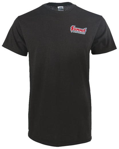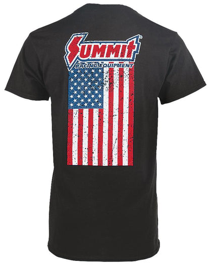 Display your passion for performance and patriotism with this American flag t-shirt from Summit Racing Equipment®. Crafted from soft, 100% cotton, this comfortable tee features a discreet Summit Racing™ logo on the front left chest. The back makes a bold statement with a large graphic that combines the iconic Summit Racing™ logo with a vertical U.S. flag. This imported shirt is offered in a variety of men's sizes to ensure a perfect fit.